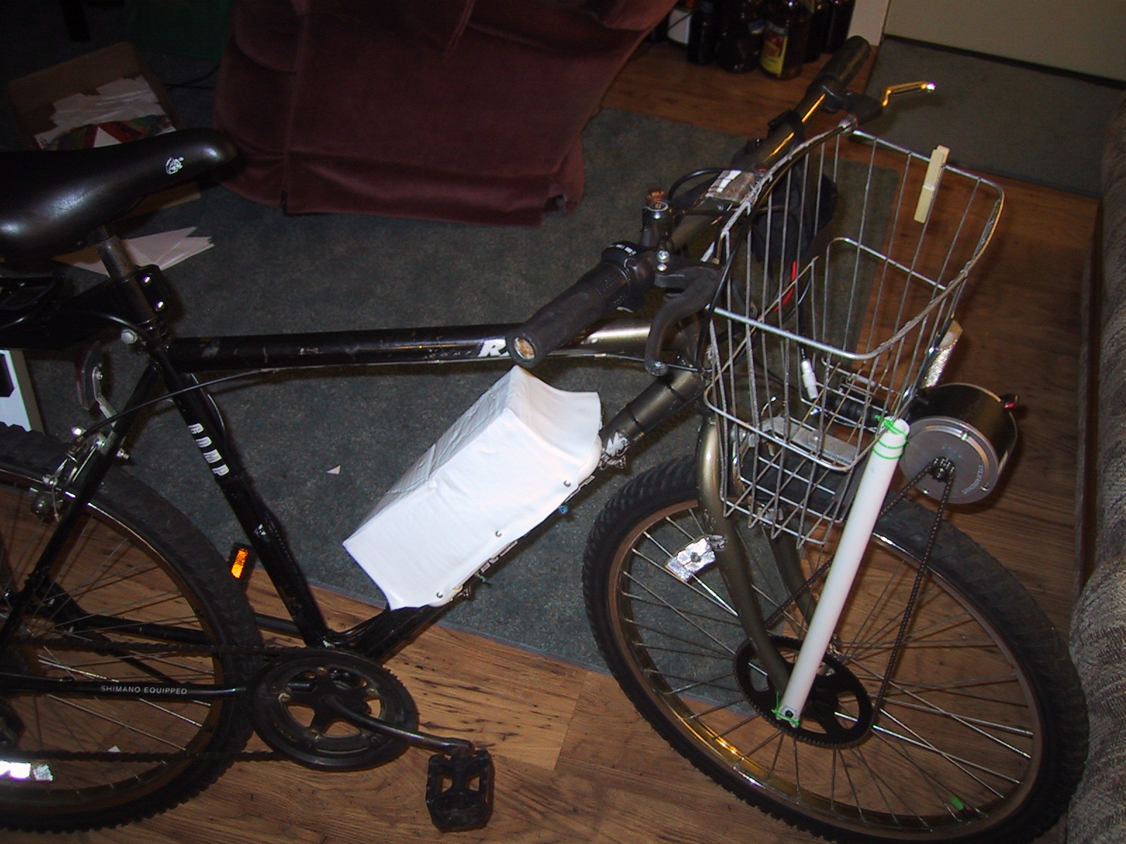 So, I bought a surplus motor controller, handlebar mounted throttle, and a 250 watt electric motor. I bolted the motor to the front of my used $20 bike, built a battery holder out of PVC pipes, and made a vacuum formed cover.