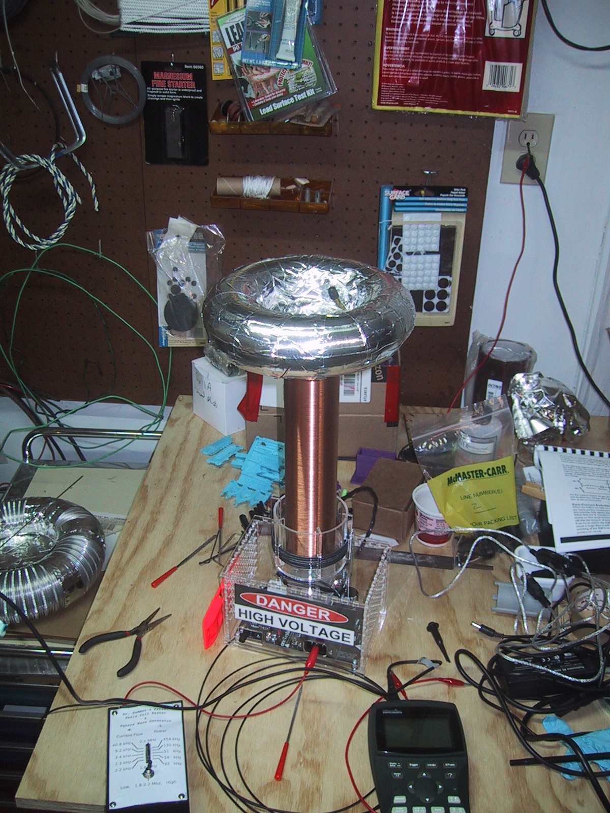 The size of this toroid is much closer to spec, although the Big Daddio pie pan holds it about 1″ higher than a straight piece of cardboard. Unfortunately, when I measured it’s resonance, I found a big signal at 340 kHz, (2.93 micro-seconds) which is even higher than my first toroid! Obviously I’m doing something wrong.
