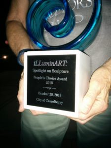 This is “Florida Weather” (a.k.a. The Tornado) an entry to the 2018 ILLuminArt show by Florida Sculpture Guild members Amy Wieck, Louise Buhrmann and Cathy Farrar. My only contribution was the computer controlled lights to add “Lightning” which can be seen in the video below: