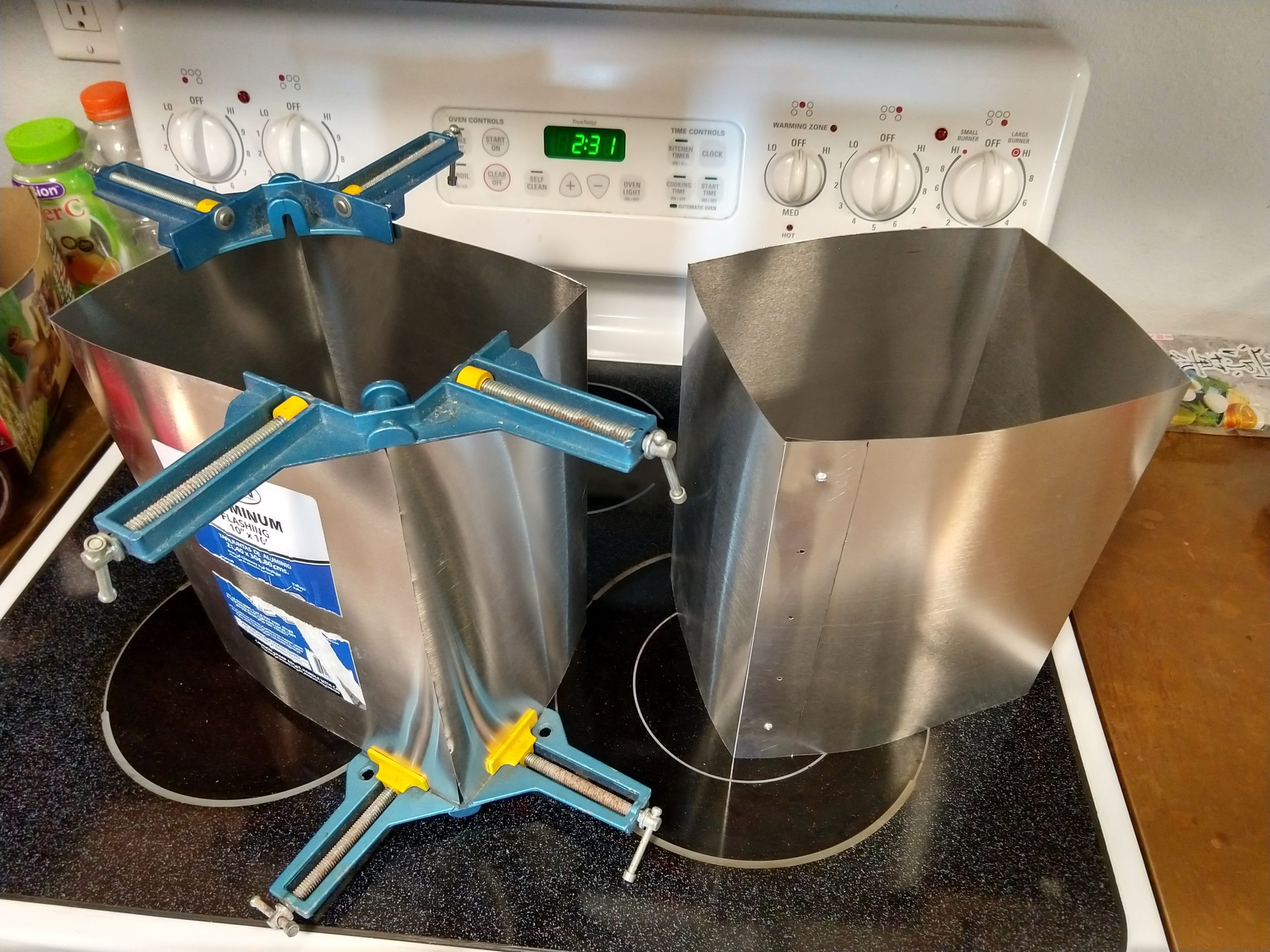 My interior cooling vessel is made out of 10″ aluminum roof flashing that I bent into a 8x6x10 square using an improved bending brake made out of boards. I used Aluminum pop rivets to hold it into a rectangular prism shape and 3M Super 77 spray adhesive to stick the first layer of PolyIso insulation to the outside of the cooling vessel. I used masking tape to mask off the small square where the TEC would be mounted later. I also used white gorilla glue to bond the foam edges and provide extra air sealing. I used butt joints on my first three layers, but got out the table saw to make a nicer 45 degree join box for the outer layer/lid assembly.